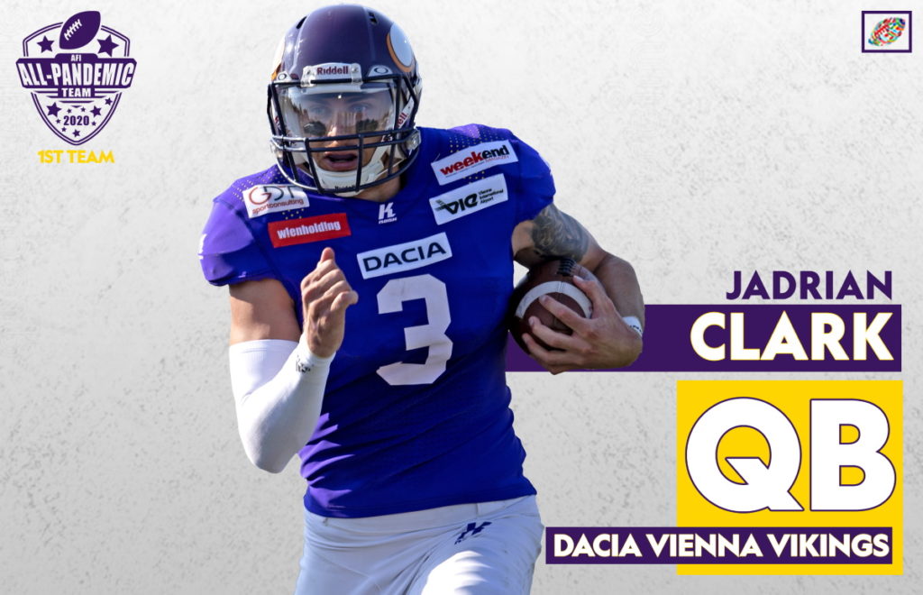 There were some terrific performances during this pandemic season and that led to some heated debates. However, for consistency on a high level, Dacia Vienna Vikings quarterback Jadrian Clark was at the top in almost every category in leading the Vikings to the Austrian Football League title, beating the Projekt Spielberg Graz Giants in three straight games.. His stats alone would justify his selection. He threw for 932 yards and 13 touchdowns in the three wins (31-19, 45-13 and 46-29), against zero interceptions. And in leading Vienna to three straight wins, he completed passes to 12 different receivers. And his speed as a rusher made him a constant threat on the ground. Finally, in a shortened season, he established himself as a true team leader.