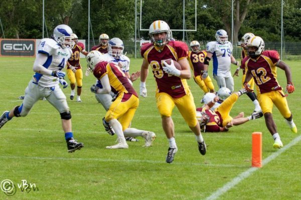 North: There were two games played in the Northern division in Germany. The Braunschweig New Yorker Lions (Europe #1) faced Kiel for the second weekend in a row and the outcome was similar with Kiel on the losing end of a 35-6 score. After starting the season impressively, the Hurricanes, suffering from a spate of injuries, have faded badly. Meanwhile the Lions demonstrated that they are a solid number one in Germany and Europe. In the other game, the Dresden Monarchs beat the Berlin Rebels 35-14. Braunschweig leads the North with Dresden, Kiel and Cologne in second, third and fourth. But the Berlin Adler who have only played three games and are in fifth, are a factor.