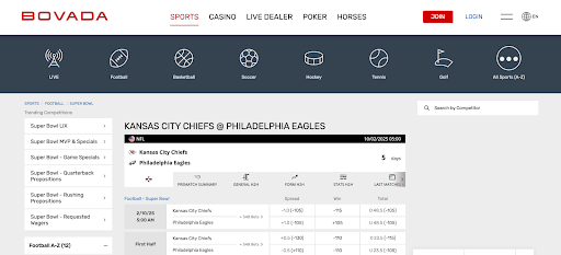 When it comes to props betting, Bovada stands out among the competition, especially for the Super Bowl. It has the most prop bets available for Super Bowl LIX, including odds for the national anthem, halftime show, and exclusive Taylor Swift props that you won’t find anywhere else. NFL fans can even make custom requests and receive odds on lines that may not even exist at other betting sites.