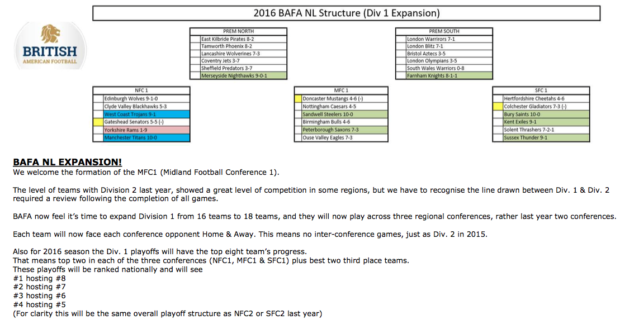 The Birmingham Bulls play in the British American Football Assocation’s National League (BAFANL) system at the Division 1 level, the tier directly below the Premiership. This season the Bulls will join the newly formed Midlands Football Conference, one of three conference in Division 1.