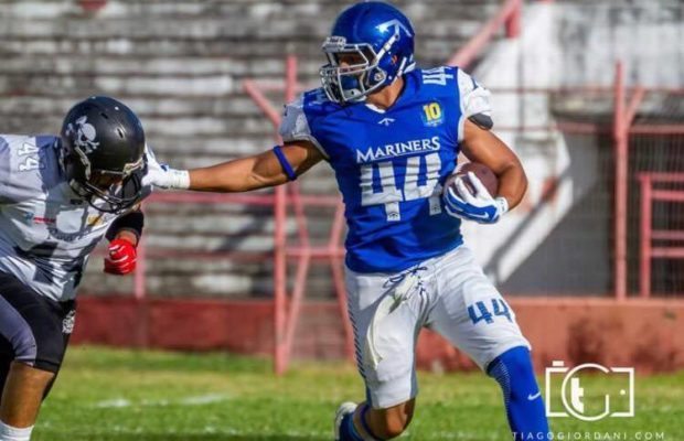 Above: Recife Mariners RB, Lucas Adolfo, stiff arms a Recife Pirates defender. Photo credit: Tiago Giordani Photography