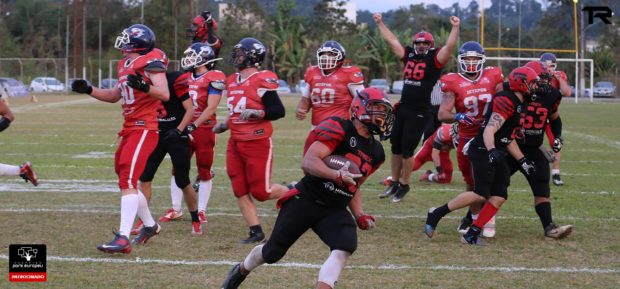 The Espectros biggest off season acquisition, play-making wide receiver, Heron Azevedo, formerly of the Cuiaba Arsenal, didn’t waste time in making his presence felt. Azevedo took the opening kickoff for a touchdown, and followed that up with a touchdown catch from quarterback Rodrigo Dantas. Azevedo‘s second touchdown was on the Espectros’ first offensive play from scrimmage and make the score 12-0 very early in the first quarter.