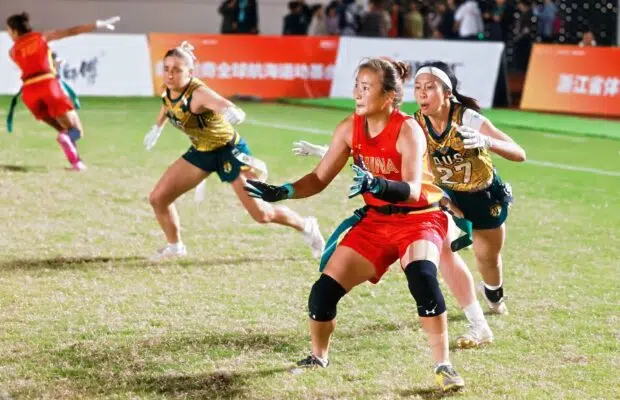 China started the second half with the ball, but Australia’s Vanessa Lu intercepted Niu to give her team the ball on the Chinese 22-yard line. Two plays later, Olivia Manfre hauled in the Davis pass for her first score of the game. Ella Calleja caught the 1-point conversion to tie the game for the third time.