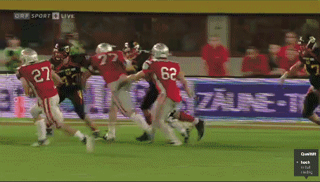 On the next series, Austrian corner Andreas Lunzer picked off an errant Ehrenfried pass and Austria started at the German 29 yard line. Three plays later Gross threw a 19 yard touchdown pass to Walch and the score going into the second half was 14-9 Germany.
