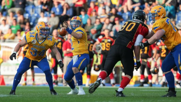 [su_dropcap]I[/su_dropcap]n a game that was supposed to be lopsided, Germany breathed a sigh of relief by finally vanquishing the stubborn Swedes 52-40, in the European American Football Championships final match of Group A play. With the win, Germany sealed a berth in the championship final on Saturday. The crowd at St. Polten, Austria was treated to an evening of terrific action in a see-saw battle between two explosive offenses, with the outcome not being decided until late in the game.
