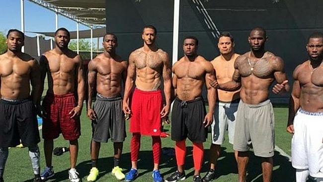Colin Kaepernick is in the red shorts and red leggings, Jarryd Hayne is third from the right. / Source: Supplied