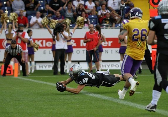 It only took them four plays as Gross hit Laurinho Walch from 14 yards out to even the score at seven 7-7 with just over two minutes left in the first quarter. Then on the ensuing Raiders drive, Van den Raadt fumbled the ball at midfield and again Vienna had a short field to work with. However, they didn’t need it as Gross threw to Stefan Postel for a 51 yard major and Vienna took the lead 14-7.