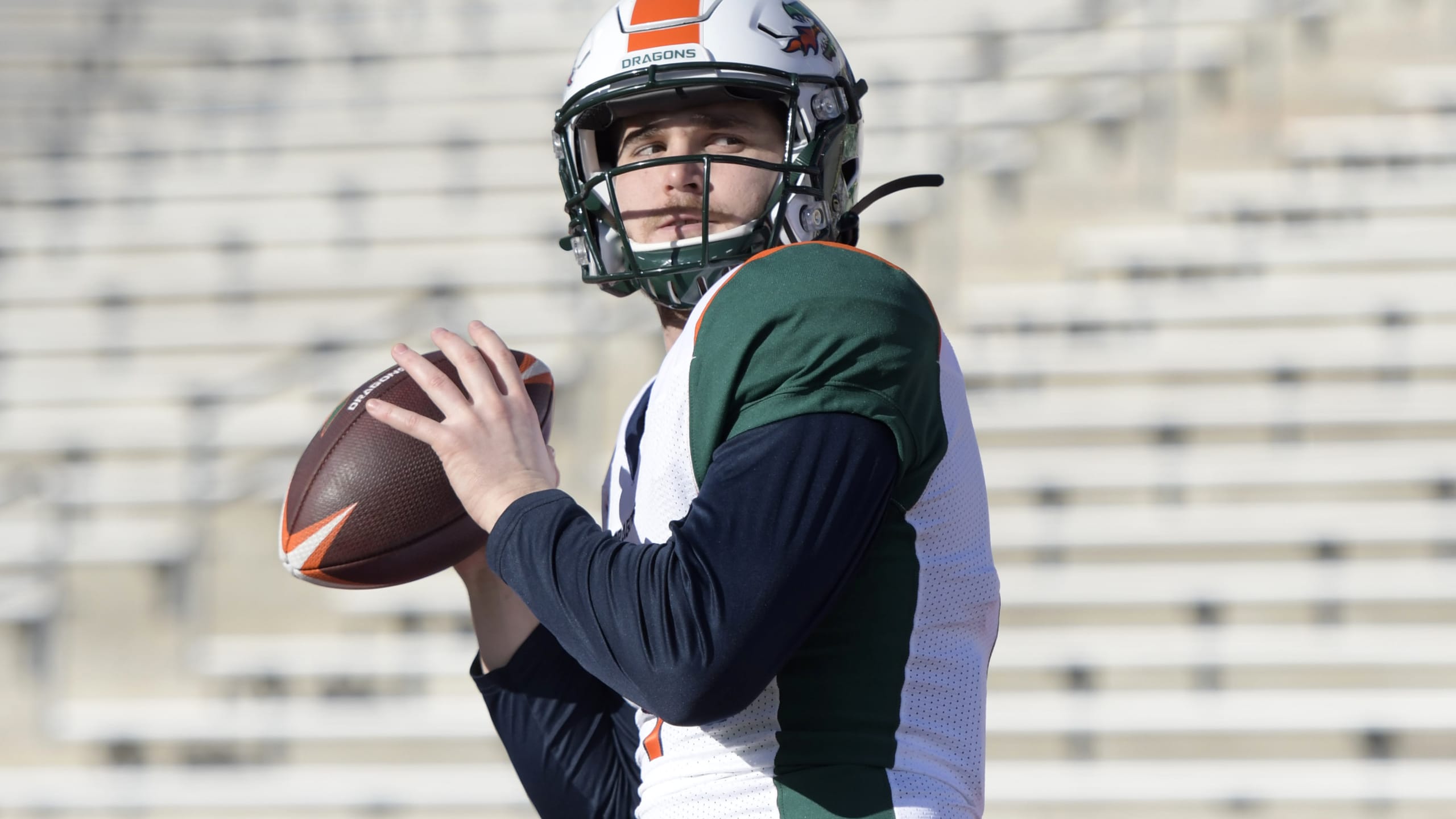 ‘Team 9’ QB Joe Callahan, pictured with the Dragons, gets ready to make a throw while in Houston for a Training Camp scrimmage. (Credit: Thomas Campbell)